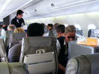 Die Stewardess: „Beruhigen Sie sich, praktisch alle Plätze des Fluges sind besetzt. Ich werde nachschauen, ob noch einer frei ist.“
